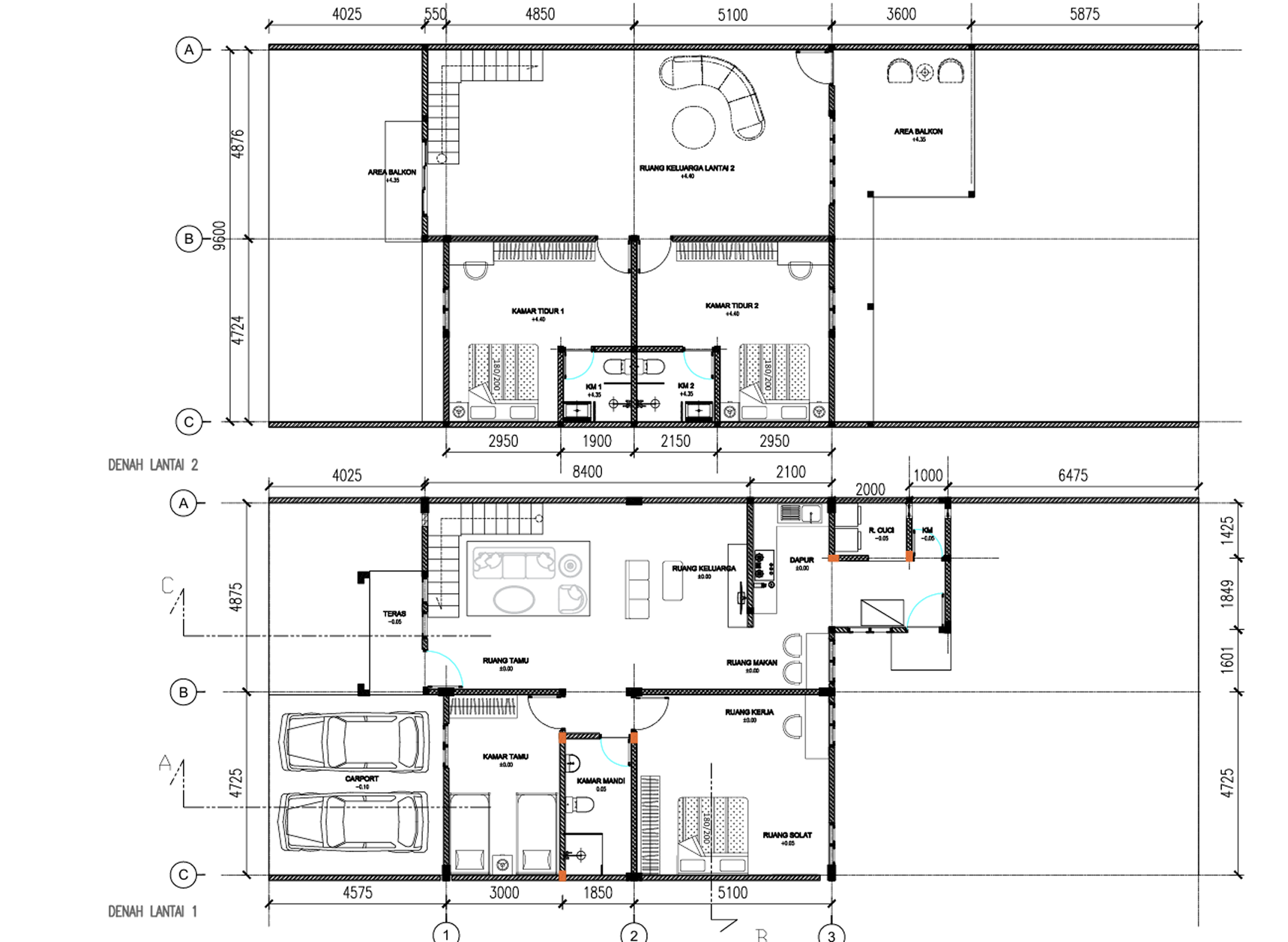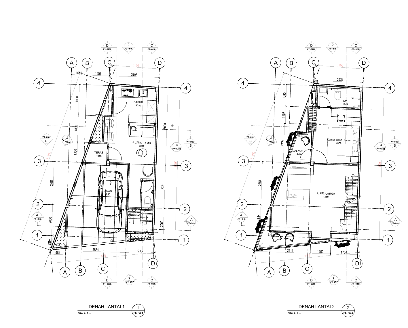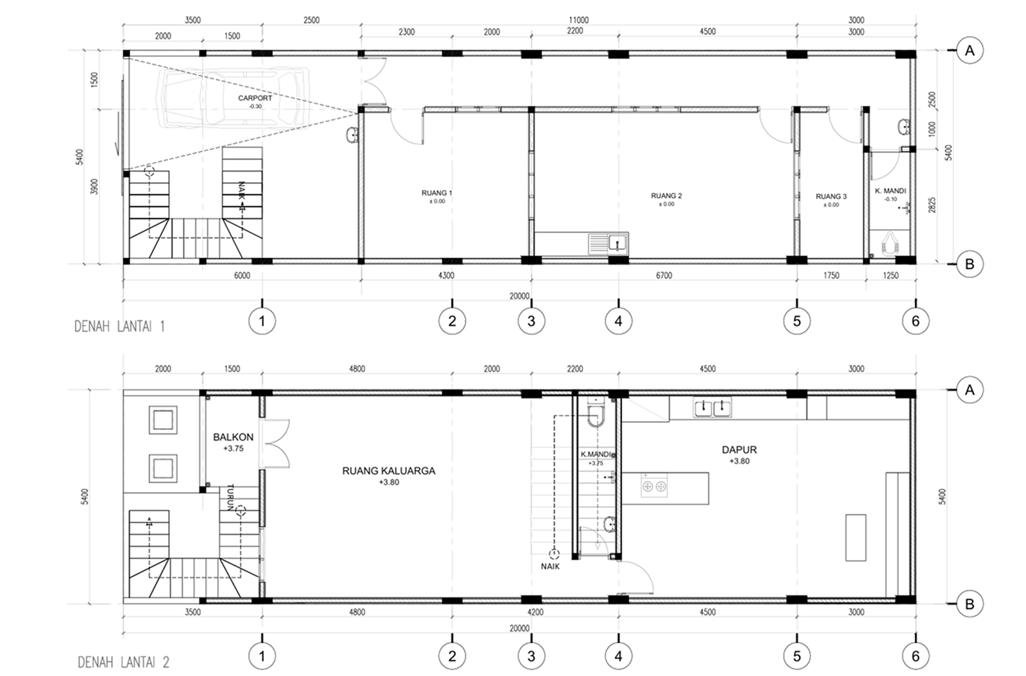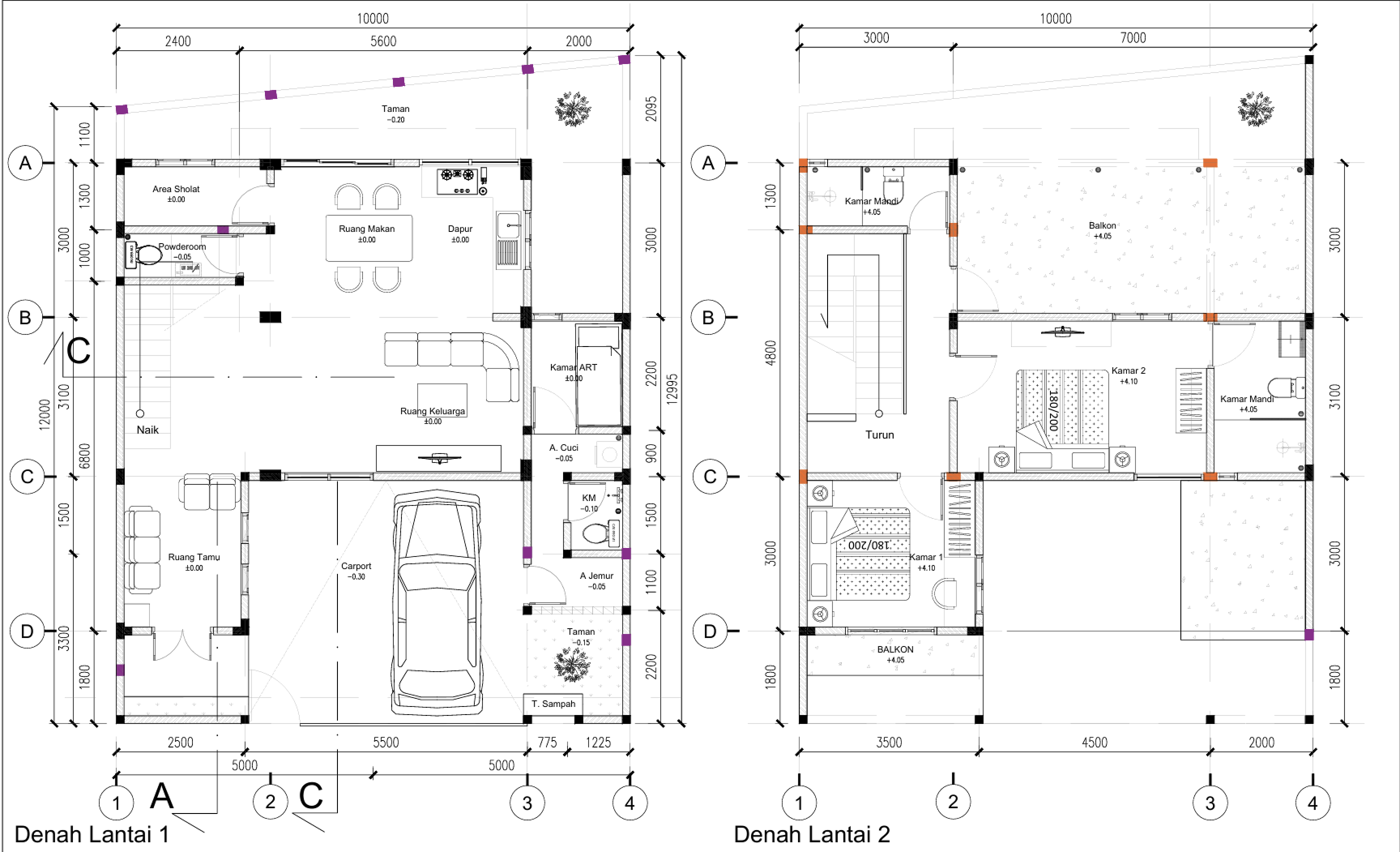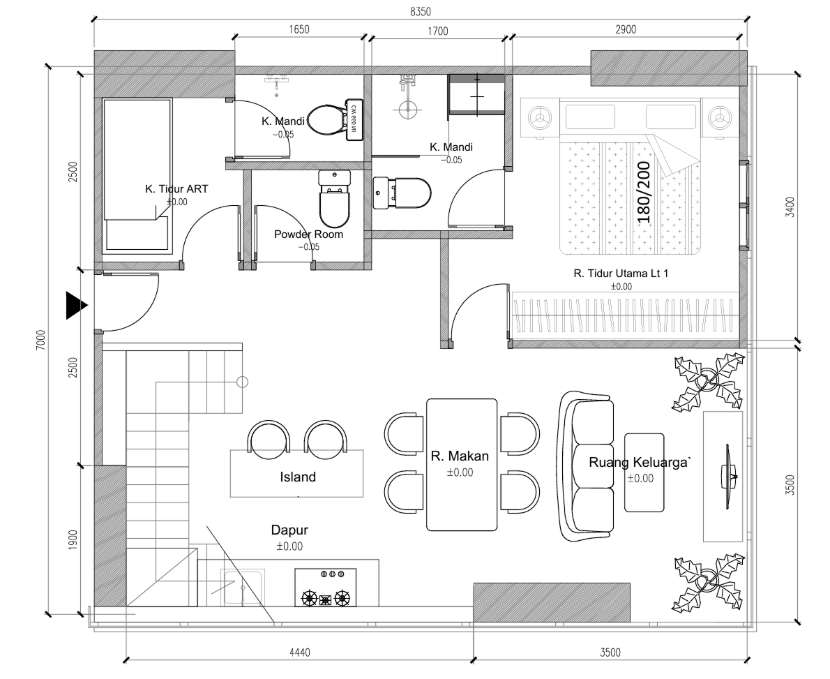 Gambar 2D berfungsi sebagai acuan kerja bagi kontraktor dan tukang. Detail ukuran, material, serta posisi elemen bangunan ditampilkan secara presisi sehingga meminimalisir kesalahan di lapangan.